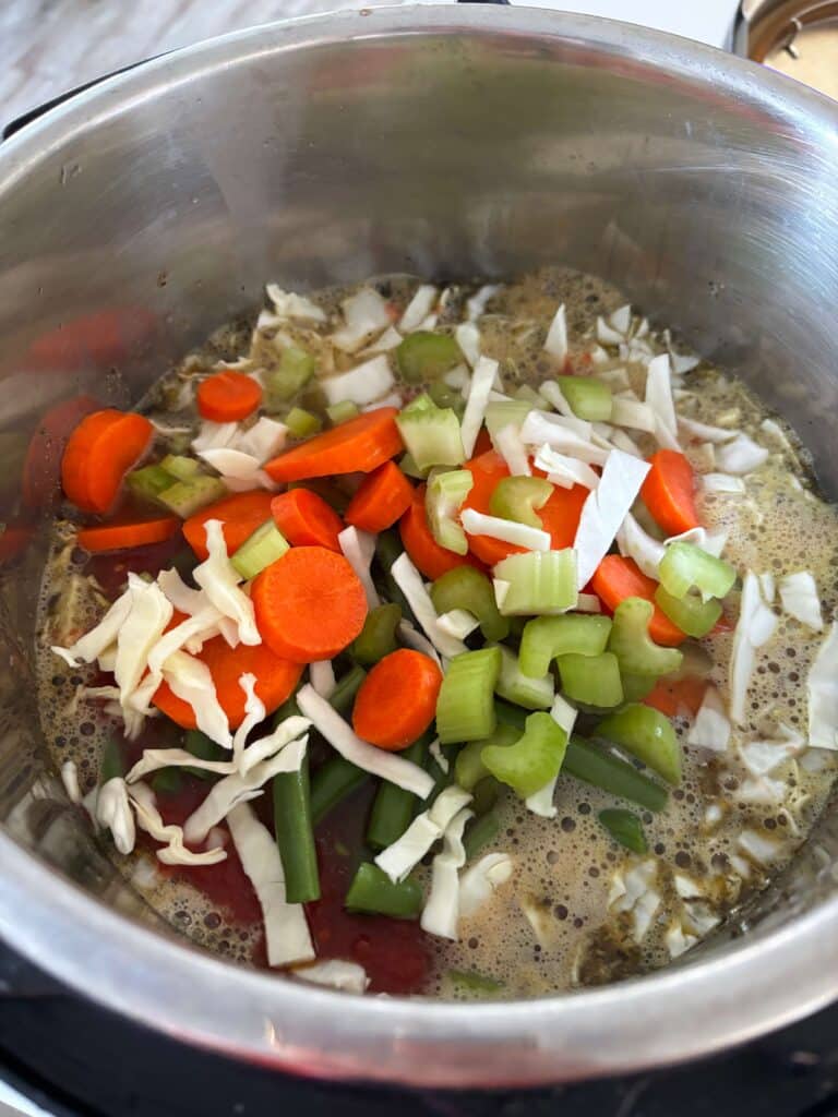 Add in the bay leaf, cabbage, carrot, celery, tomatoes and green beans.