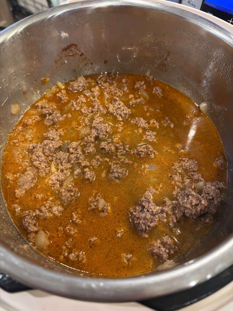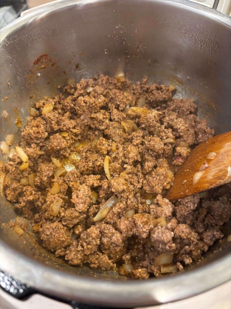 - Turn Instant Pot to sauté setting. When display says HOT add in the ground beef and break it up. Add in the onion. Brown for 5 minutes. Drain off excess grease. Stir in the salt, pepper, smoked paprika, cumin and chili powder.
