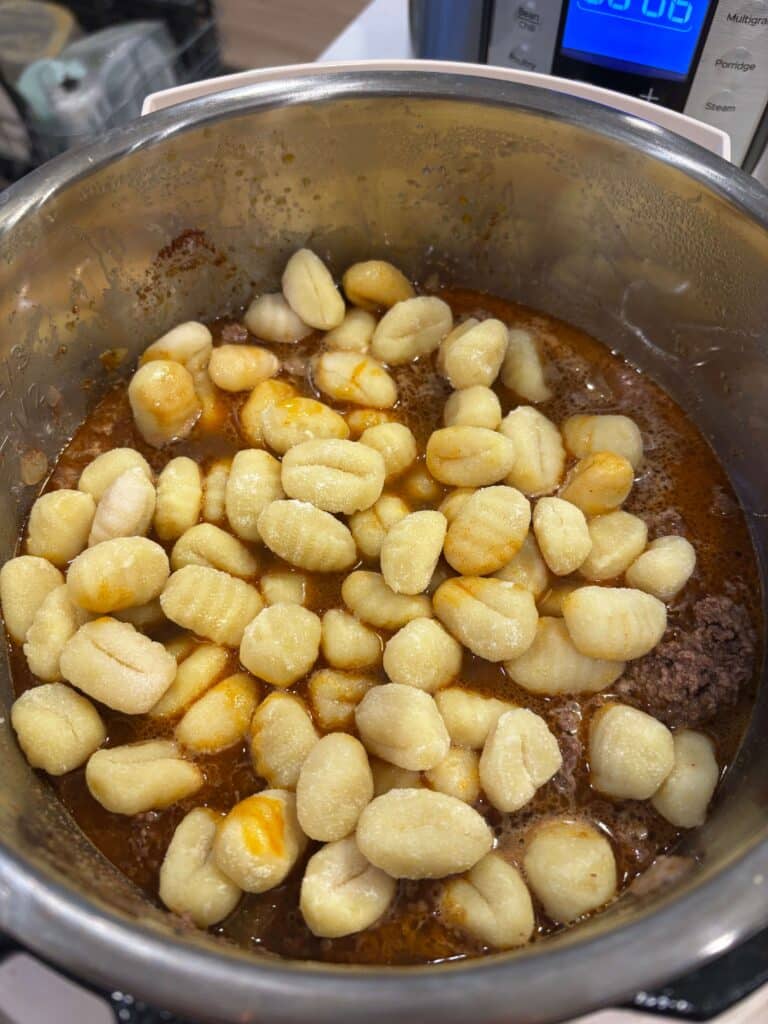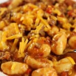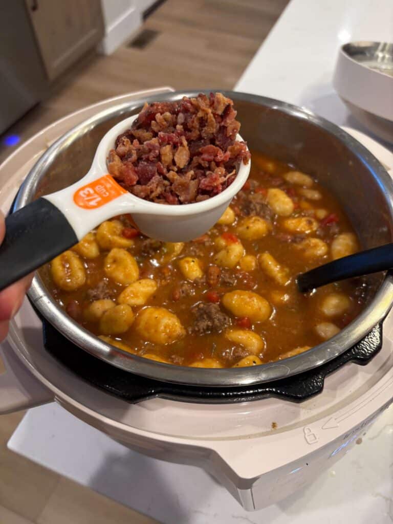 Pillowy gnocchi, seasoned ground beef, chili beans, tomatoes and green chiles pressure cooked or slow cooked together, then finished off with bacon crumbles and melty cheddar.