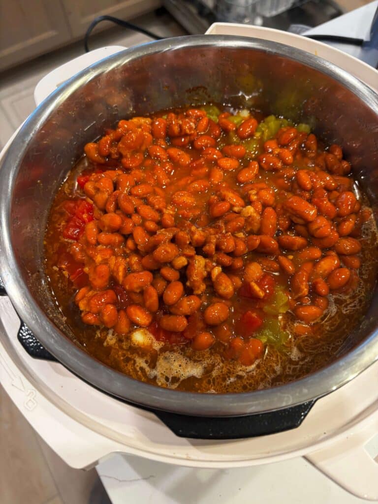 A hearty stew with smoked sausage, ground beef, bacon, corn and beans. You can make this in the Instant Pot or the slow cooker.